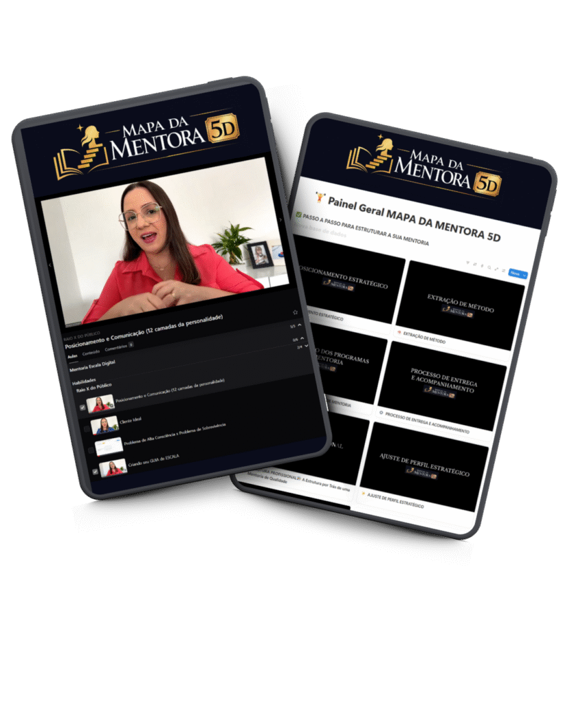 Esse manual virou o que hoje é o MAPA DA MENTORA 5D: um sistema pronto, validado, com todos os modelos, ferramentas e processos que você precisa pra estruturar e entregar sua mentoria com leveza e resultado.